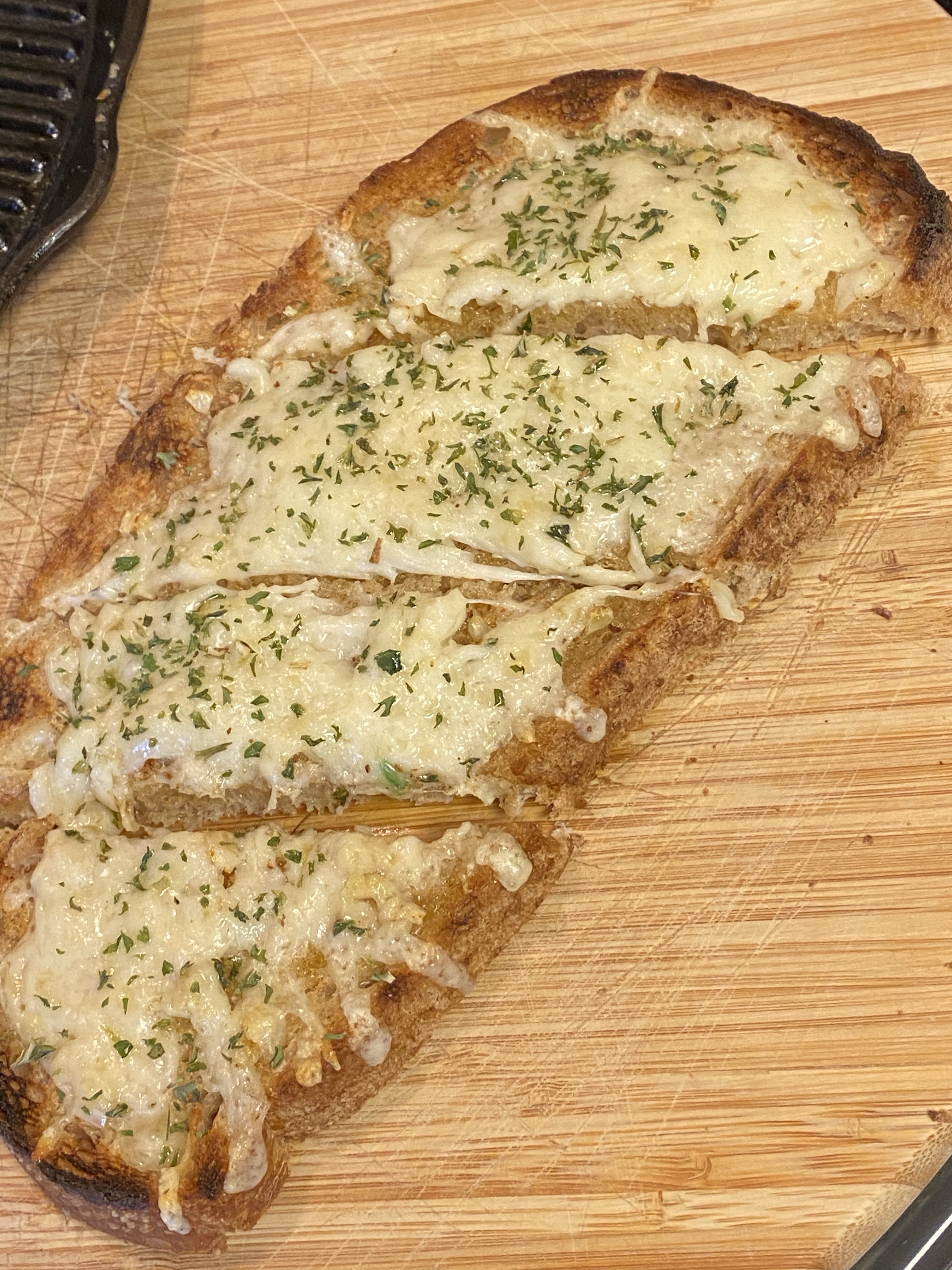 You can have that same gooey feeling when bitting into a slice of Toasted Sourdough Garlic Cheese Bread.