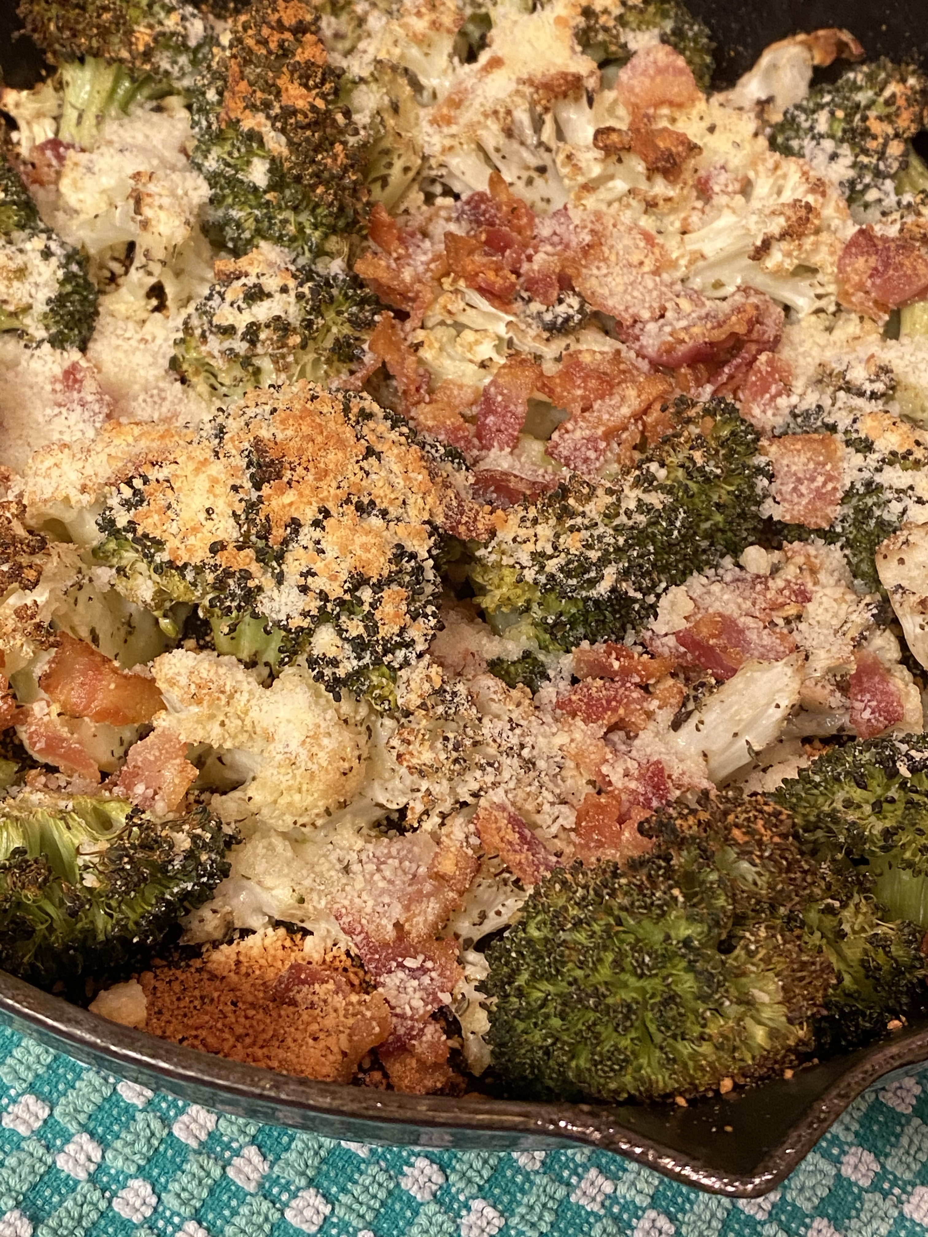 This is a one skillet recipe. It contains deliciously yummy smoked bacon, parmesan cheese, broccoli and cauliflower.