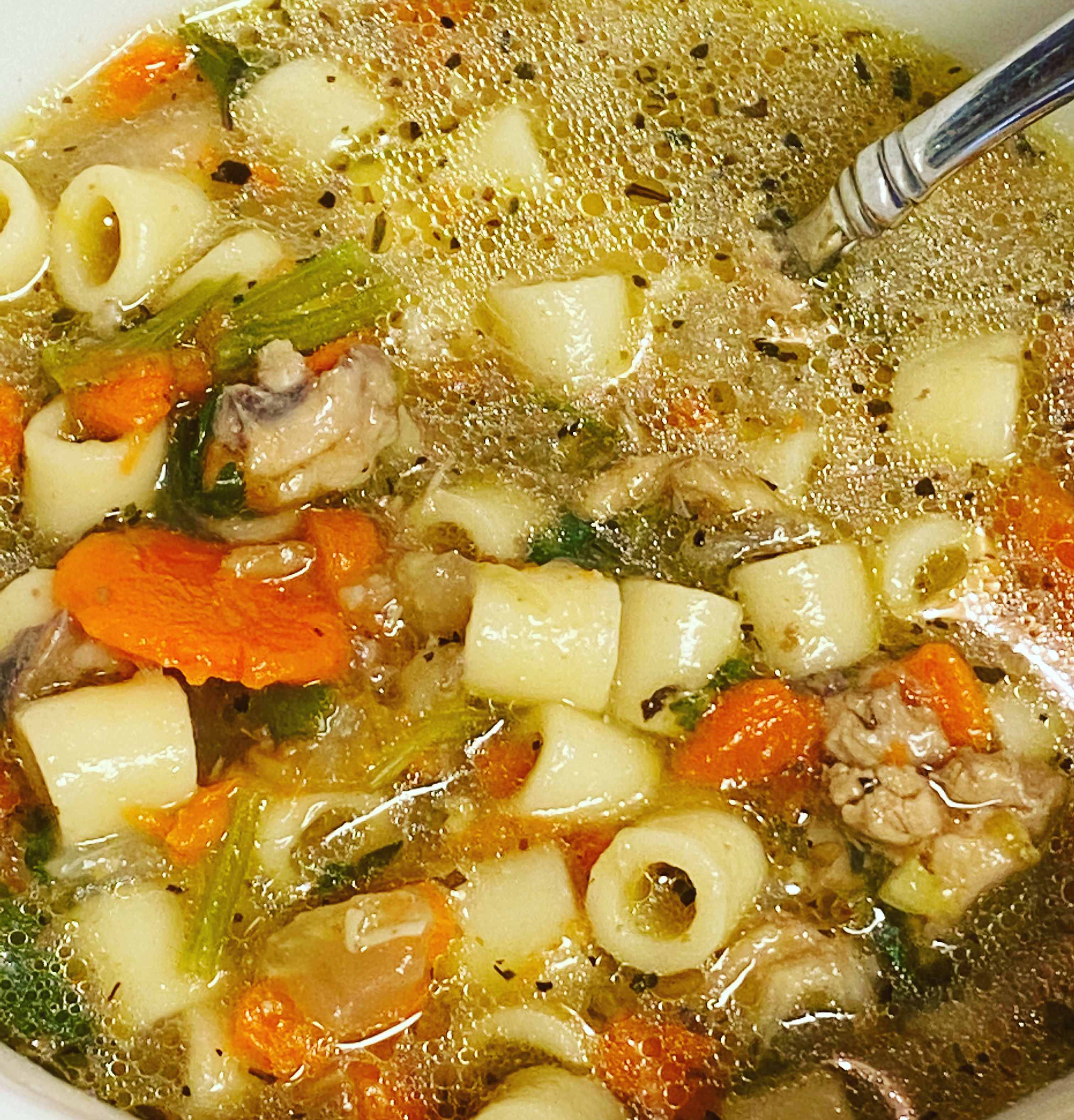This homemade chicken soup recipe has no rice or noodles, but rather a pasta called Ditalini.