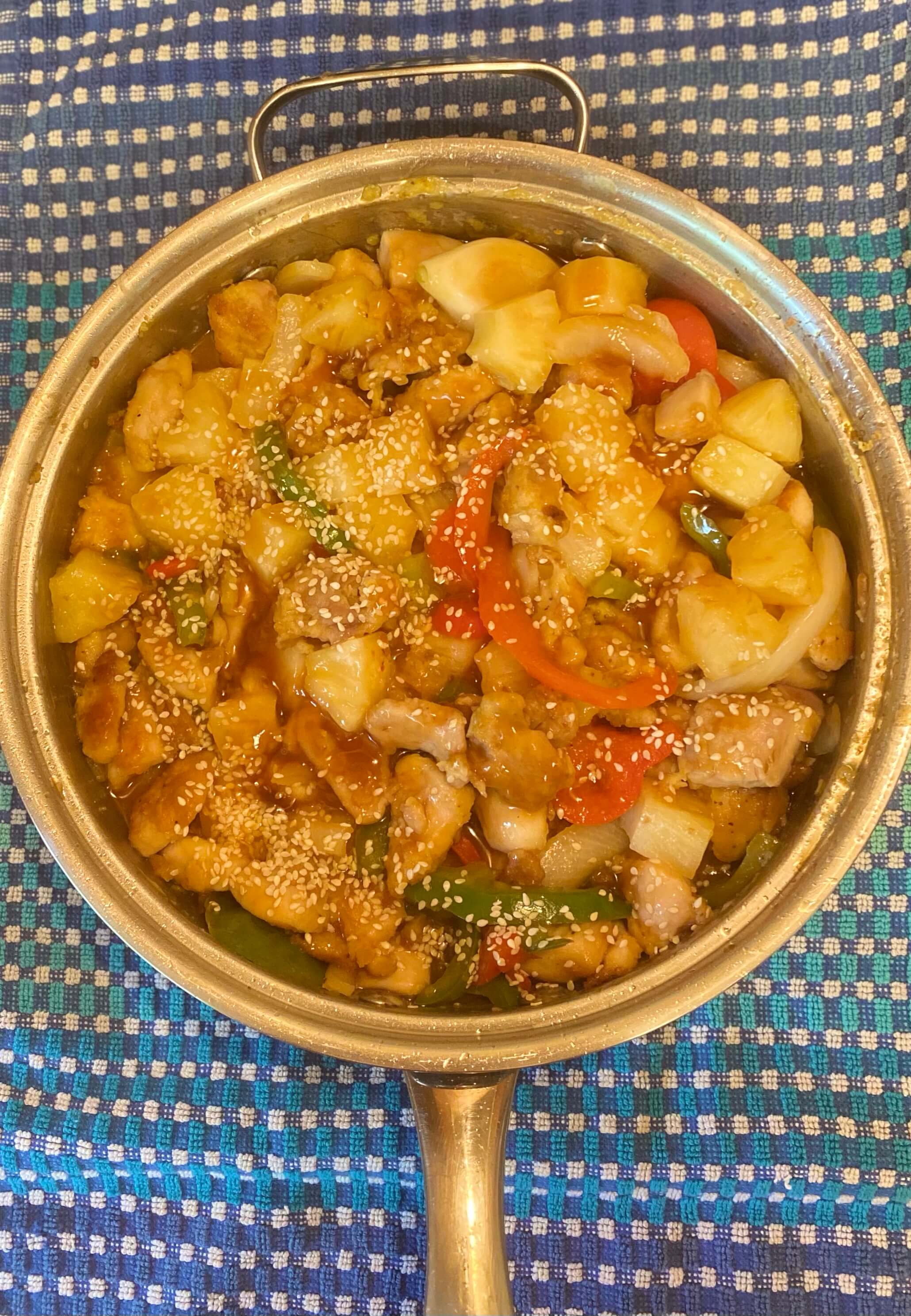 Dinner’s ready in just 30 minutes with chicken thighs pared with onions, sweet peppers and stir-fried with a homemade tangy sweet-and-sour sauce.