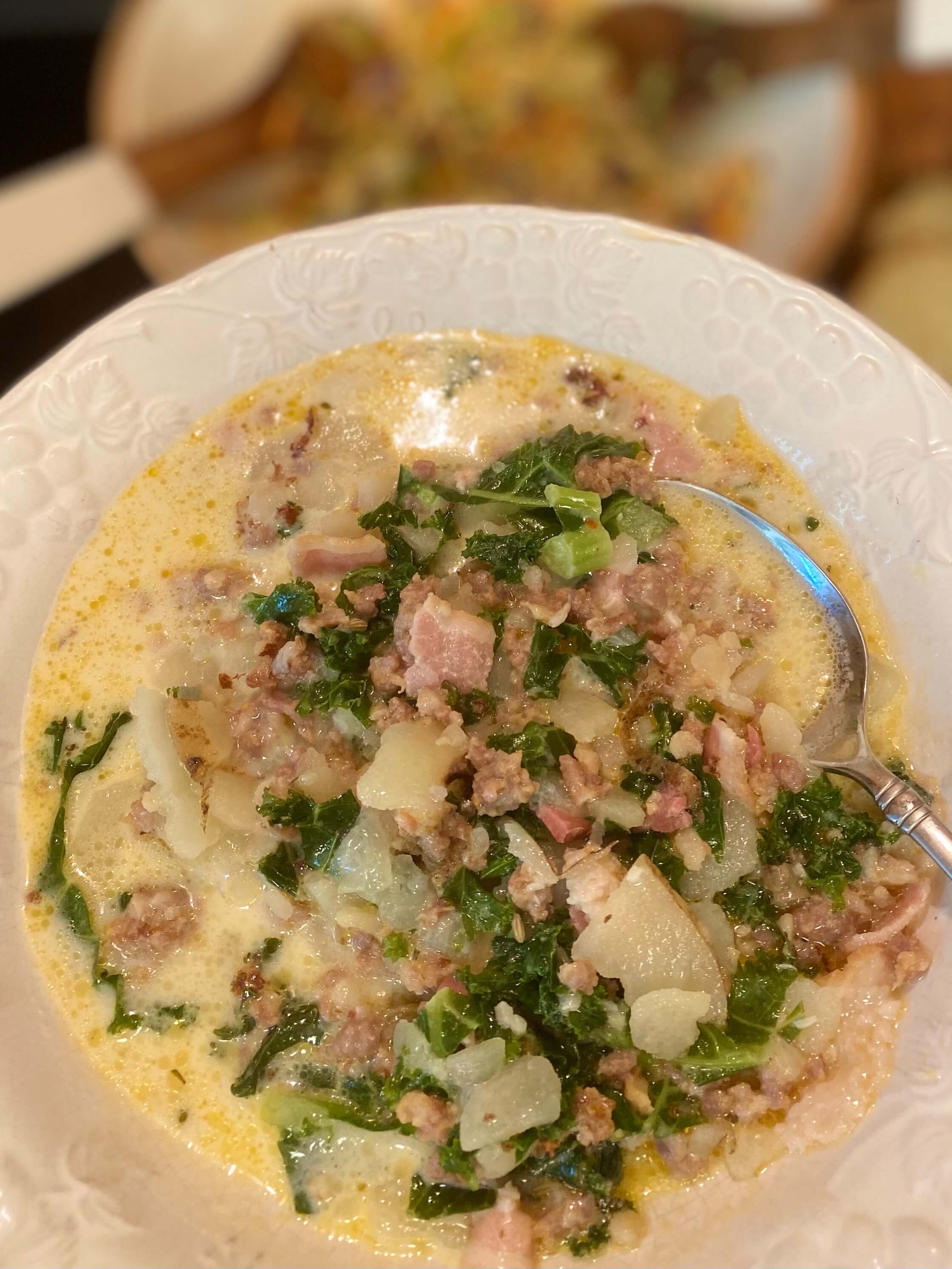 Zuppa Toscana is exactly that, a very hearty, rustic, savory and creamy Italian soup, that is loaded with spicy sausage, bacon, potatoes, herbs and kale.