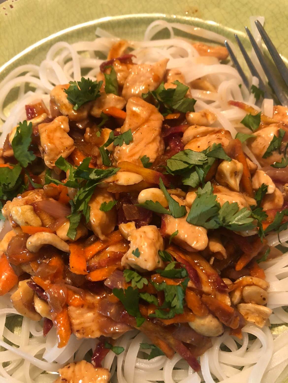 You can choose to either add the noodles and stir-fry in or plate some rice noodles and top with the stir-fried chicken – cashew mixture.
