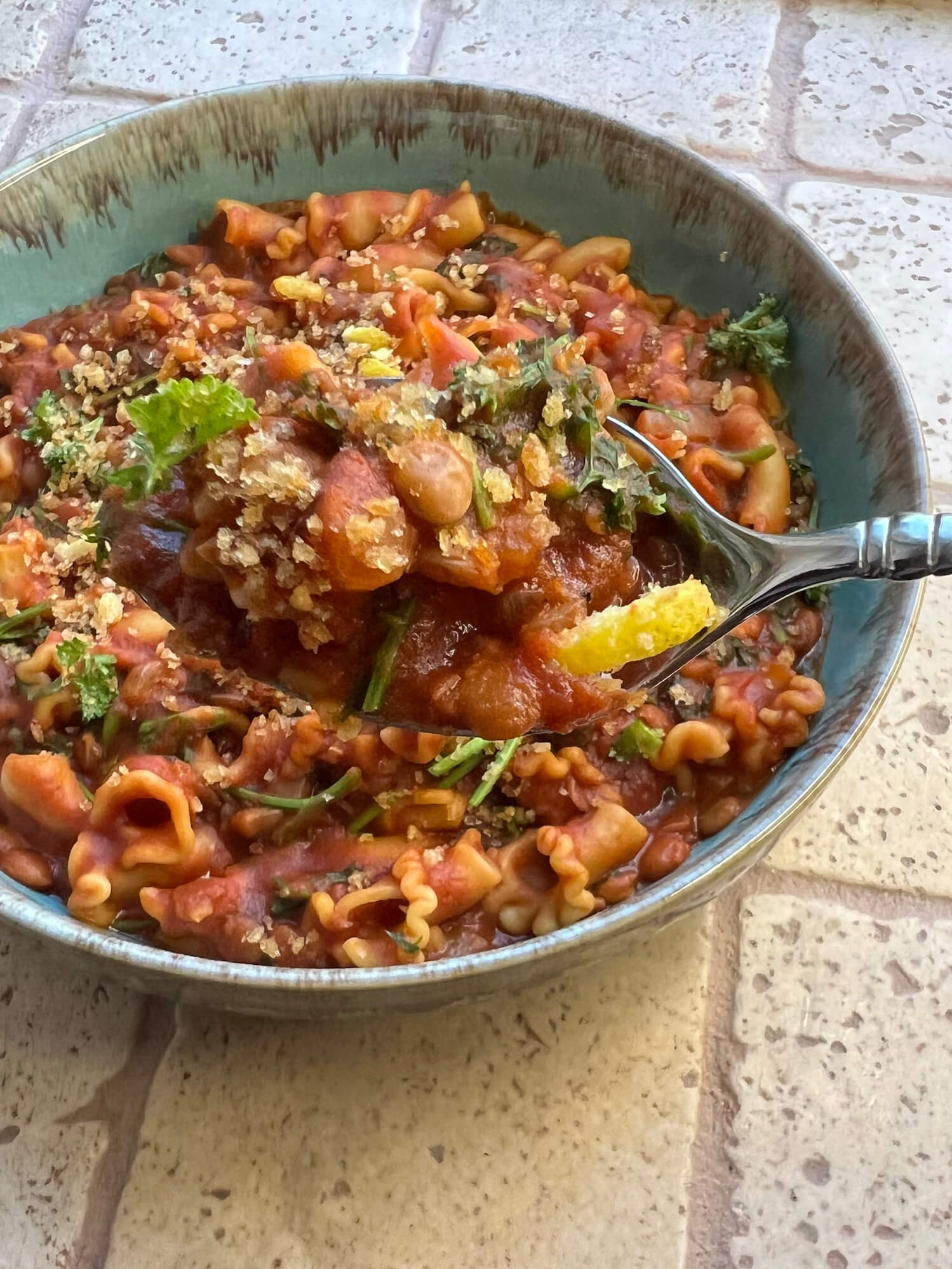 Pasta With Spicy Tomato Lentil Sauce Topped With A Crunchy Spiced Panko And Zesty Lemon Blend