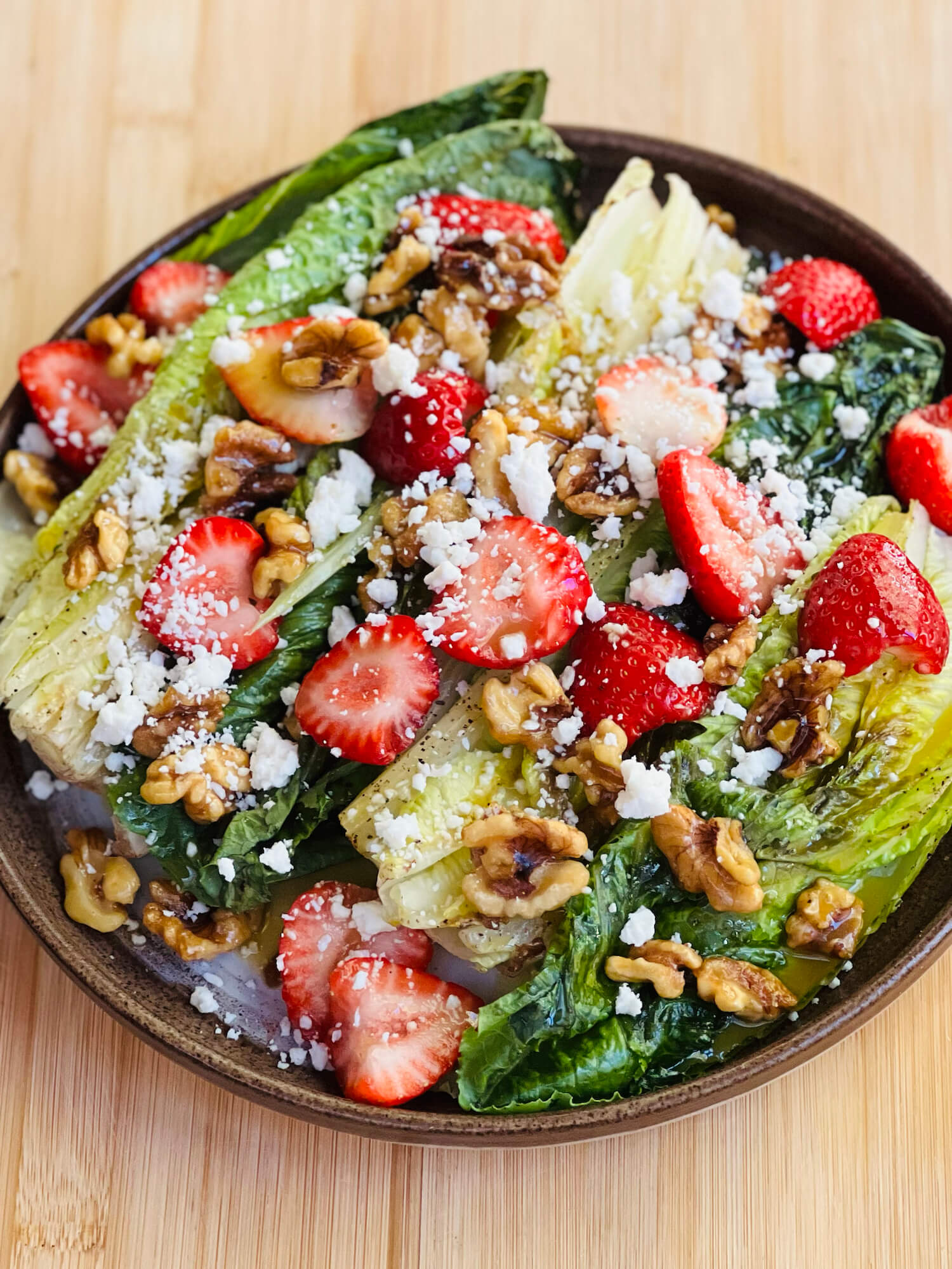 Top with sliced strawberries, candied walnuts and crumbled Cotija cheese.