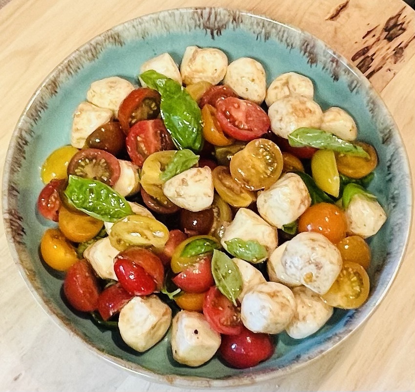 If using larger mozzarella balls, you can cut them into bite-sized pieces. If they’re the smaller balls, you can leave them whole.