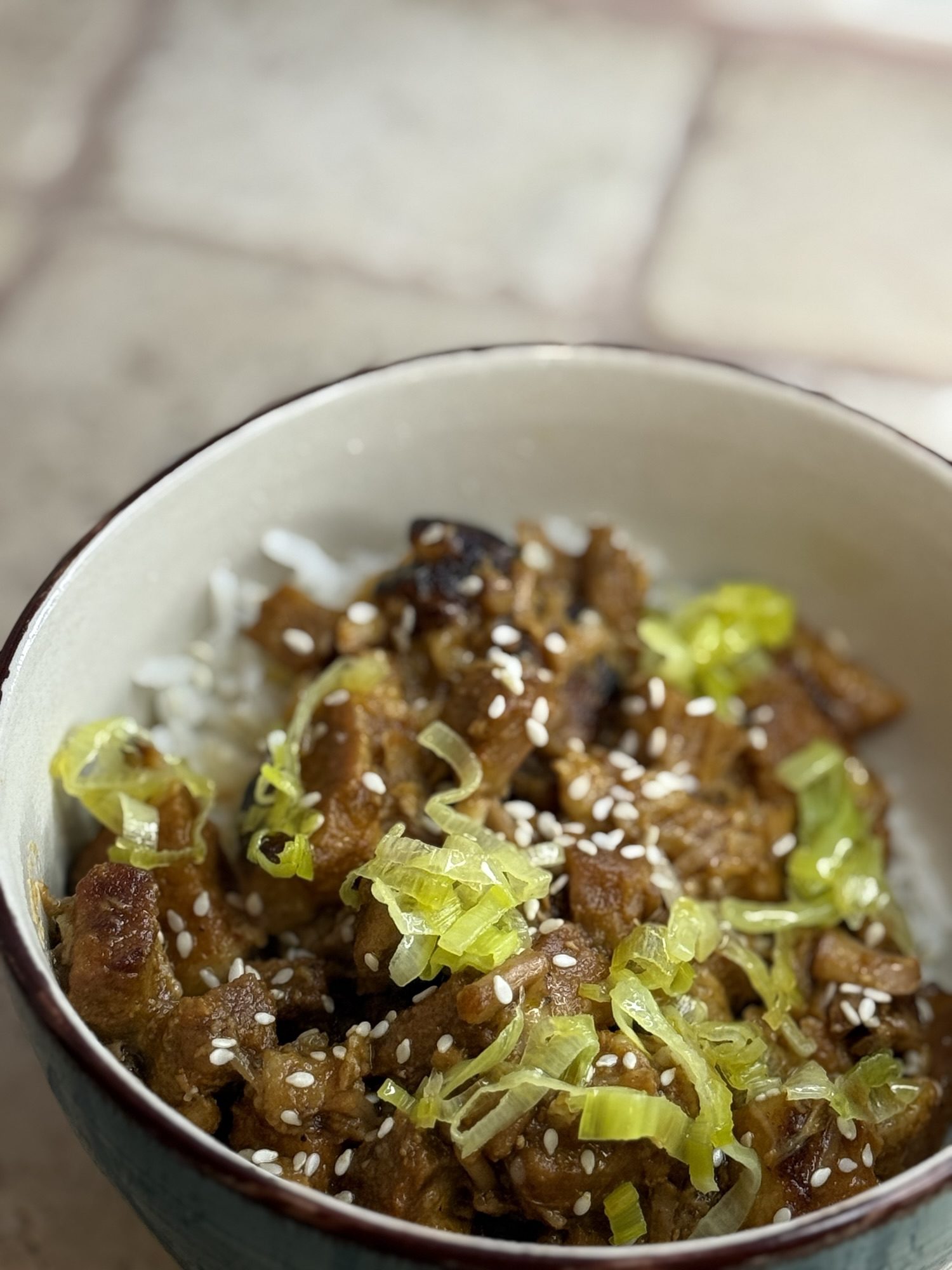Remove the lid, tilting it away from you to avoid the hot steam. Scoop the pork belly cubes into a bowl with a slotted spoon. Set aside.